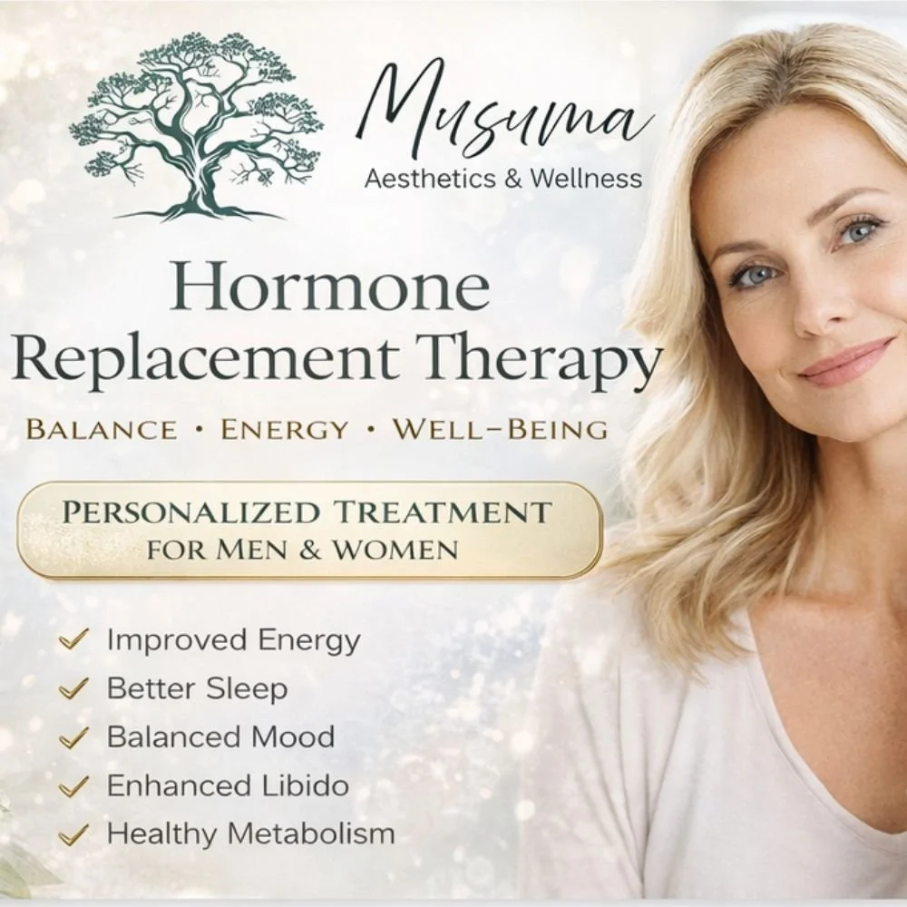 At Musuma Aesthetics & Wellness, we offer personalized Hormone Replacement Therapy (HRT) designed to restore balance, improve quality of life, and support long-term wellness. Hormonal imbalances can affect energy levels, sleep, mood, metabolism, libido, mental clarity, and overall health. Our goal is to help you feel like yourself again — safely and intentionally.